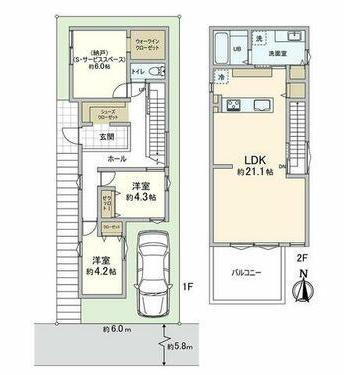 | 阪急『西宮北口』駅まで徒歩約15分の平坦地です。南西向きの一部連棟です。約16帖のLDK、水回り全てが2階にあり、生活動線を考えた設計です。シャッター付ビルトイン車庫です。 |